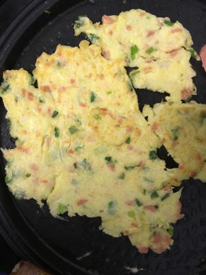 电饼当刷上薄薄一层油 加热,手上沾点油 将糊状均匀倒入电饼当中 不宜太后。煎至两面金黄即可。