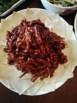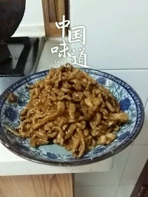 热油,下甜面酱,盐糖调味,一点点老抽上色,小半碗水,至大开,下肉丝,炒匀出锅