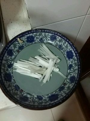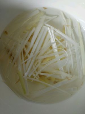 姜切片略拍,取一点葱丝同放一碗内,加清水,泡成葱,姜水。