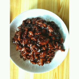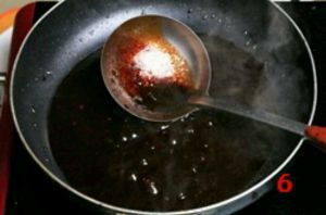 锅烧热加油炒到变色加入混合酱汁,翻炒,加半碗水后收汁盛盘