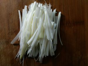 上浆后一定要放一点生抽,拌匀,放入冰箱冷冻5-15分钟,这是个让肉不黏锅而且嫩滑的小窍门,将葱白切成丝放在盘中。
