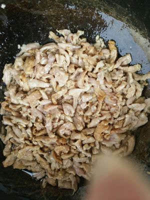 炒锅上火烧热,加油,待油温4成时放入从冰箱取出的肉丝滑散,至入成熟时取出,放入盘中滤干油分。