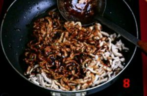 等酱汁开始变黏时,将肉丝放入,不停地炒动,使甜面酱均匀地沾在肉丝上。