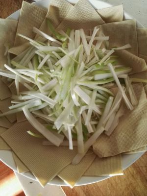 ok喽,肉丝盛入铺好的豆皮葱丝上。豆皮要用热水烫一下啊,那样吃起来才嫩嫩的。