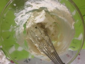 搅拌马斯卡彭至没有颗粒,另外取一个容器打发奶油,备用