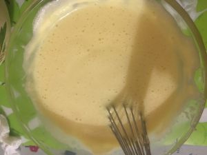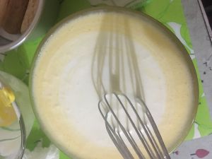 将第四步的蛋黄乳沫倒入芝士里,边倒边不断用打蛋器搅拌。