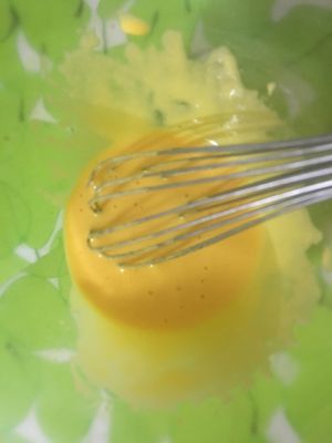 将碗坐在热水里,隔水加热并不断搅打,使蛋黄混合物的温度上升到80℃。蛋黄搅打成浓稠的乳沫状。注意温度不要太高,以免蛋黄形成颗粒。
