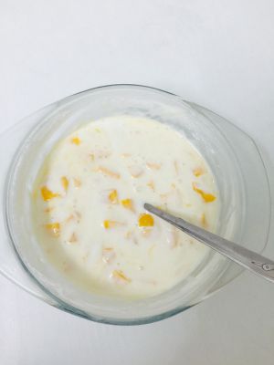 冷藏12小时后的酸奶,浓郁醇厚,我都用大汤勺了,拉丝好吃,浇到芒果容器里,多少随你心意啊哈哈