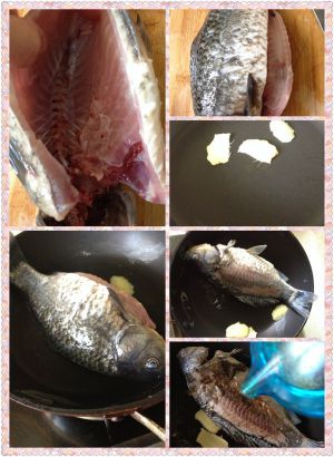 鲫鱼肚子内部清洗干净(一点黑都不留)外面也尽量刮干净这样煮出来汤才不腥!接着把锅加热放入姜片爆香把鲫鱼两面煎至金黄