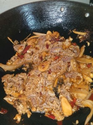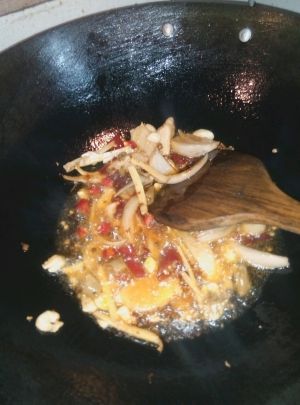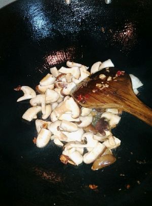 锅中放少许油,炒香菇和辣椒,再放入炒过的腰花,炒一分钟,再撒点鸡精粉,勾芡即可。
