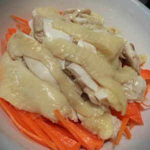 切红萝卜丝或者青瓜丝铺底…鸡腿冰水冷却…去骨…切块…