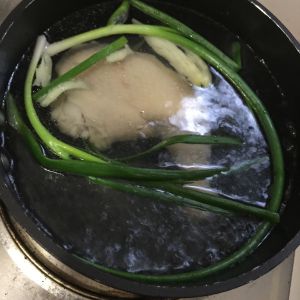 小锅放适量清水,放入拍好的半颗生姜,干辣椒3,4个和适量干花椒。再放入鸡腿肉。水开后中火煮15—25分钟。用筷子能轻松插入鸡腿肉且没有血水流出,就煮好了。捞出鸡腿放入有冰块的水中,沥干水分备用。