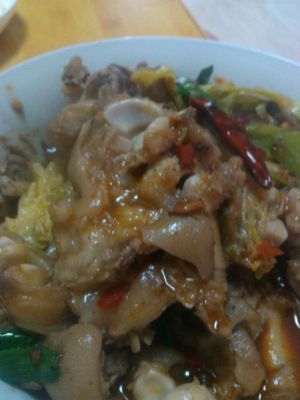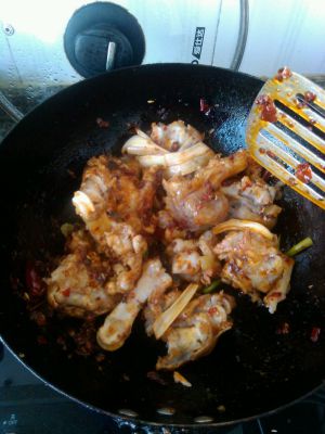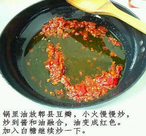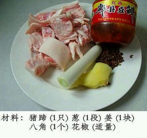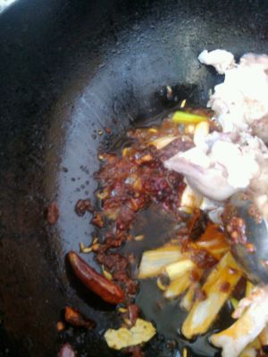 热锅凉油下豆瓣酱和火锅料煸炒,在加刚才准备好的调料,炒香后下猪蹄