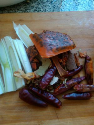 准备调料,葱,辣椒,八角,草果,香叶,桂皮,一小块火锅料