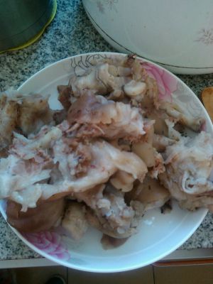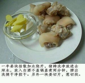 猪蹄洗干净,冷水下锅焯水,水开后转小火焯十分钟,温水冲干净。