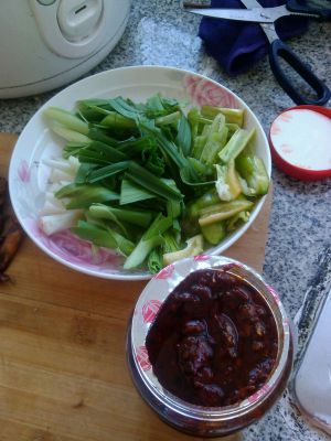 郫县豆瓣酱,切好的蒜苗,青椒,还有莲菜片