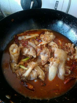锅里放适量油,然后放适量冰糖小火炒糖色,糖色炒好后把猪蹄放进去,炒上色之后扒在一边,把那些大料,花椒,辣椒,大葱放进去炒出香味,然后捻出大葱不要,加料酒生抽老抽一起翻炒,炒的时间越久上色越深,然后倒入和猪蹄平齐的开水,加点十三香,大火烧开转小火炖煮二小时,出锅时大火收汁!
