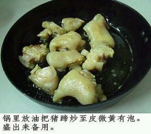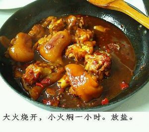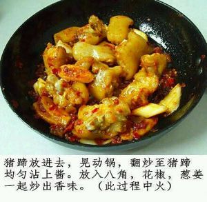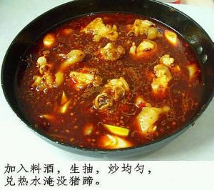 放入料酒生抽炒均匀,加热水淹没猪蹄
