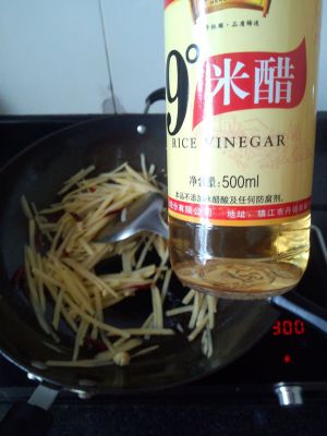 沿锅边倒入白醋,醋遇热大部分酸味挥发,留下醋香。加食盐和白糖调味。