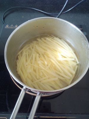 锅里加水,烧开,放进土豆丝烫半分钟,捞出冲冷水,沥干水分。