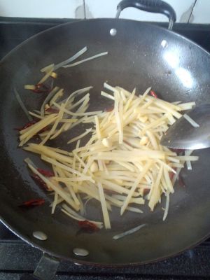 锅热入油,放入红辣椒后几秒后放入葱姜蒜爆香,放入青椒丝胡萝卜丝,翻炒两下放入土豆丝 ,翻炒