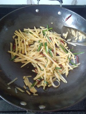 全程大火快速翻炒,保证土豆脆爽。出锅前加入小葱段即可。