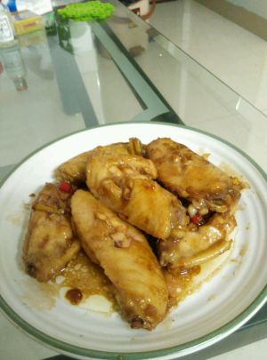 热锅,倒入食用油,先炸一下,然后把鸡翅捞上来,倒出油,剩一点,蒜头生姜辣椒爆香,再倒入鸡翅,加可乐,酱油,收汁