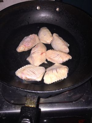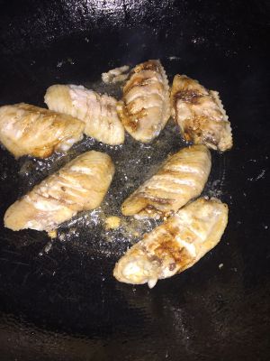 把吸干水份的鸡翅锅中放少许油煎至两面金黄