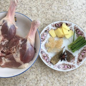鸭肉洗干净,放锅里凉水慢慢煮开,加点生姜