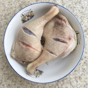 水烧开,鸭腿岀水两分钟,捞出后在正面划两刀