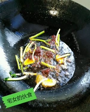 热锅冷油爆香葱姜和豆瓣酱。