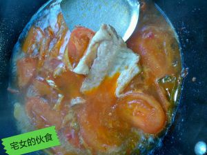 翻炒到蕃茄软烂后加入开水,鱼架,白糖,盖盖焖煮到汤汁香浓。