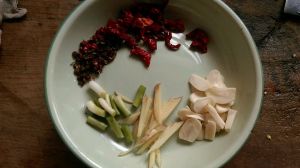 锅中放油,冷锅下葱,姜,辣椒,花椒,冷锅下是为了避免佐料变黑