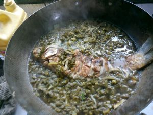 放入酸菜,蒸鱼油,姜,一起煮20分钟