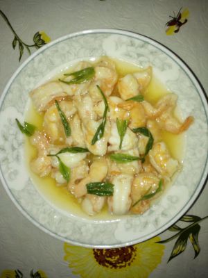 再次热少量油,放生姜2片,下虾仁翻炒,加少量泡好的茶叶水,再加水淀粉适量,出锅!