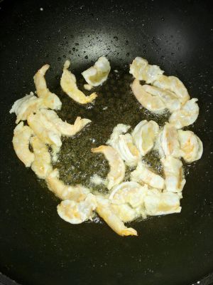 锅中油烧热,滑入浆好的虾仁,快速滑散盛出备用。