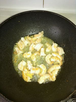 锅内加油,虾仁倒入锅内翻炒