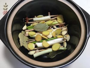 葱姜蒜 大料 香叶 放在砂锅里面均匀撒好