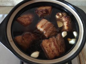 盖上砂锅盖大火煮沸,立即改最小火慢慢炖,炖半小时以后,将肉翻面肉皮朝上继续炖半小时左右,具体时间以收汁到适当程度为好,特别是快好的时候,一定要守在砂锅旁,盯住汤汁,以免汤汁收干烧焦 烧好以后将肉块夹出装盘,将汤汁浇在肉上,晶莹剔透的美味东坡肉完成啦!