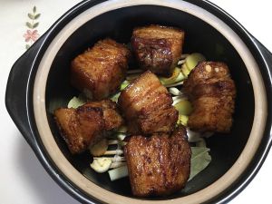 砂锅里小葱垫底,姜切片,五花肉切好的块,皮朝下入锅,倒入酱油、黄酒和糖,再放200g水,盖好盖子。小火慢炖2个小时左右。大概炖一个小时之后放入盐。