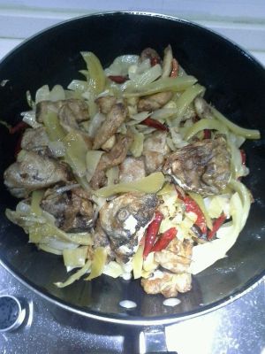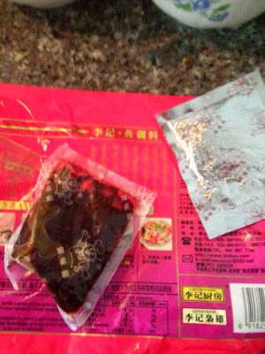 炒出香味后加入水、一勺黄灯笼辣椒酱(可不放),放入剪好的巴沙鱼(怎么剪随意),加一勺料酒(可不放)煮鱼,约煮10分钟,出锅时点缀的剪碎的小米辣(一个)即可。