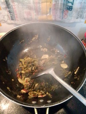 准备好完毕后,就先把酸菜放锅里先去炒干水份后倒起,然后锅里下油烧热将蒜、姜先炸,后放干辣椒、花椒一起,然后放酸菜炒,后放鱼头鱼骨一起炒