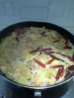 鱼骨(块)炒好就该加水了,爱喝汤就多加点,只喜欢吃鱼就不用加很多,待水开后将鱼片一块块放入锅中,等鱼块变成白色的就可以开吃了