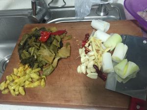 材料准备,鱼切块,酸菜切好,小米椒切碎,姜拍扁哚碎,葱切小段