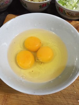 接着把3个鸡蛋打在碗里,往里面加入半汤勺的料酒,少许盐,把蛋打均匀。