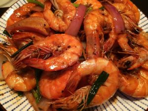 热锅下油,爆香蒜粒。放虾轻爆三分钟左右,然后下调味料加盐炒入味。再下葱段和洋葱翻炒一下起锅就好。