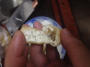 取一小块,有三角凸起的朝下,光滑面朝上,用筷子在中间挖烂