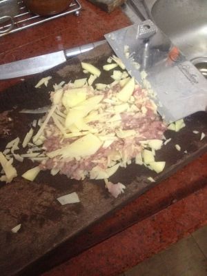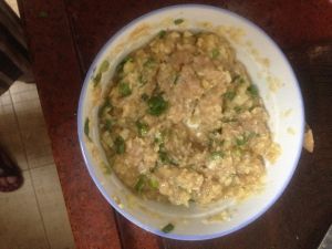 剁好的肉碎跟土豆加生粉,加油,加盐,耗油,拌匀。。。。
