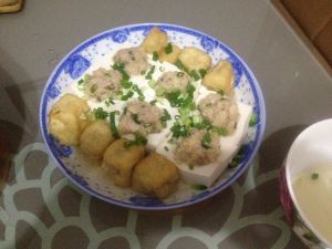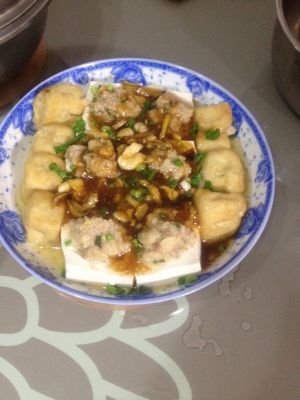 2、老豆腐中间挖一四方小口,放入馅料,顶上再放上虾仁。