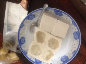 把买来的豆腐切成长5CM,宽3CM大小备用。切好后开始把陷镶进豆腐里面。